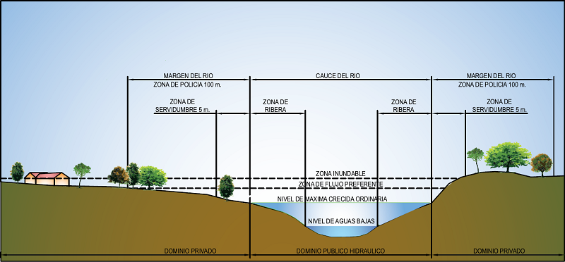 Para llevar a cabo actuaciones en cauces, embalses, lagos y lagunas públicos, y en sus zonas de policía, cumpliendo con la normativa, el primer paso es identificar la ubicación de dichas actuaciones con respecto a la delimitación del dominio público hidráulico y la zona de policía de cauces. Dicha delimitación, establecida en el Reglamento de Dominio Público Hidráulico (RDPH), responde al siguiente esquema de zonificación fluvial.