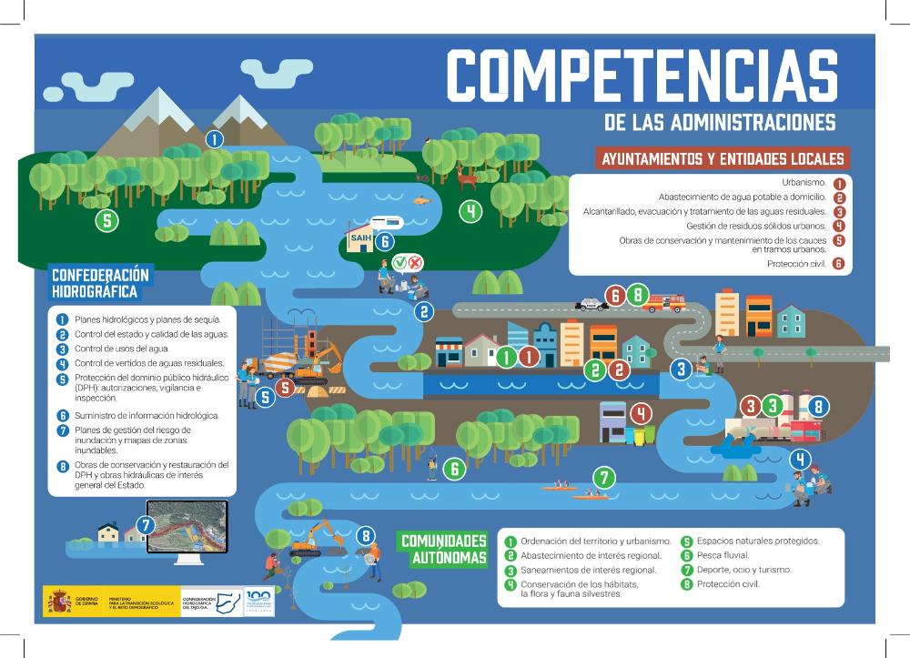 El título VII de la Constitución Española establece la organización territorial del Estado y las competencias de cada administración. Concretamente, la Ley de Aguas asume dicho mandato en su artículo 128 donde dice que ka Administración General del Estado, las Confederaciones Hidrográficas, las Comunidades Autónomas y las Entidades locales tienen los deberes de recíproca coordinación de sus competencias concurrentes sobre el medio hídrico con incidencia en el modelo de ordenación territorial, en la disponibilidad, calidad y protección de aguas y, en general, del dominio público hidráulico, así como los deberes de información y colaboración mutua en relación con las iniciativas o proyectos que promuevan. (Art. 128 del Texto Refundido de la Ley de Aguas).