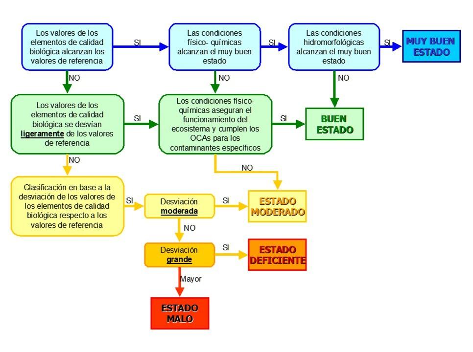 A partir de este análisis, el estado ecológico de los ríos se clasifica como muy bueno, bueno, moderado, deficiente o malo, según el siguiente esquema.