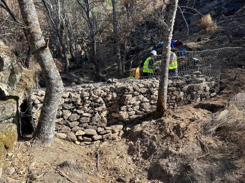 La zona del incendio tiene grandes pendientes, lo que limita la posible actuación de maquinaria. Por tanto, la CHT ha procedido a la realización de albarradas y diques de gaviones en el DPH de las vaguadas que vierten de forma directa a las tomas de abastecimiento y de los arroyos que vierten al arroyo Huertas antes de la entrada en el núcleo de población de Caminomorisco.