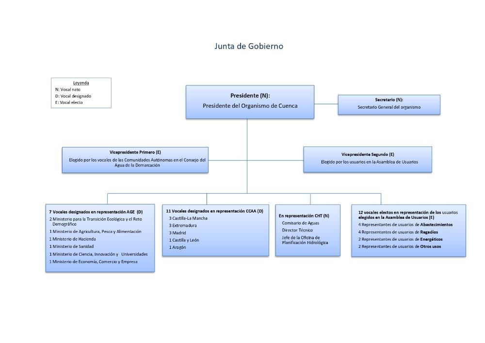La composición que puedes ver en el siguiente esquema está definida en los artículos 29 y 30 del RD 927/1988 (RAPAH) y al artículo 4 del RD 927/1989 por el que se constituye este Organismo de cuenca y garantiza la participación de las Comunidades Autónomas integrantes de la cuenca hidrográfica de forma proporcional a su extensión en ella, así como de la Administración general del Estado y de los usuarios. Puedes ver la actual distribución de los vocales aquí: Composición actual de la Junta de Gobierno de la CHT