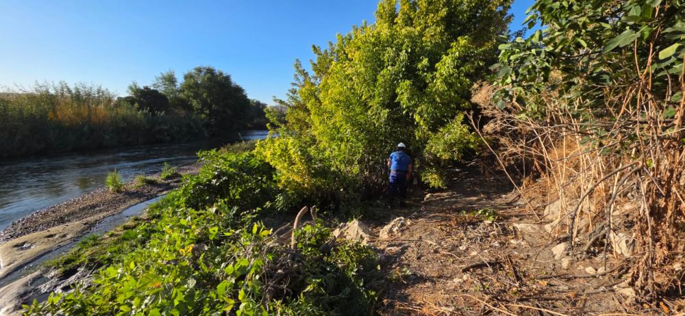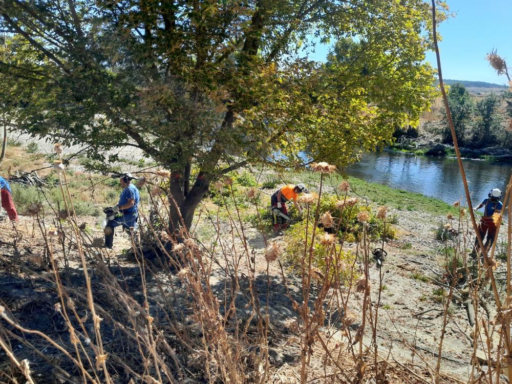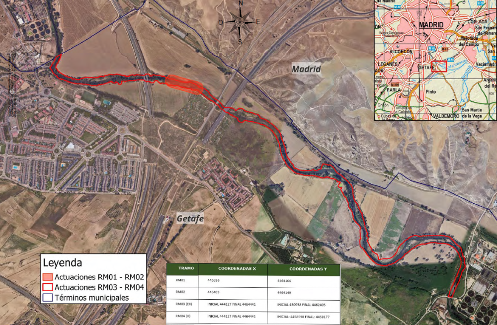 Actuación RM03: localizada a lo largo del tramo de 9.400 m de longitud del rio Manzanares a su paso por el término municipal de Getafe, y consistirá en la eliminación y retirada de restos de todos los pies de diferentes especies vegetales invasoras presentes en dicho tramo, como son la caña (Arundo donax), el ailanto (Ailanthus altissima), falsa acacia (Robinia pseudoacacia) y arce americano (Acer negundo).