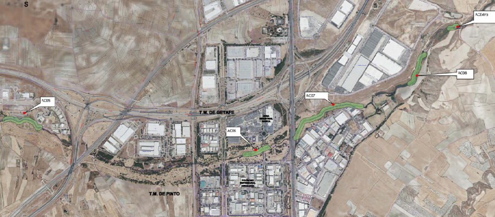 Actuación AC07: se localiza en el tramo situado aguas abajo del viaducto que cruza la autovía A-4, en el que el arroyo Culebro discurre entre el polígono industrial Los Gavilanes (T.M. Getafe) en la margen izquierda y el polígono industrial Arenas de Pinto (T.M. Pinto) en la margen derecha. Debido al estado actual de los taludes de la margen derecha y su proximidad con el polígono industrial, resulta necesario realizar alguna actuación. Este tramo tiene una característica peculiar, que es que el margen derecho tiene más altura que el margen izquierdo muy probablemente debido al relleno y/o acopio de materiales en esa zona. Teniendo en cuenta lo anterior, se propone resolver los problemas erosivos con dos encauzamientos al inicio y final del tramo, con un subtramo entre los encauzamientos con refuerzo de gaviones en márgenes, corrigiendo a su vez la pendiente del talud y revegetando el mismo.