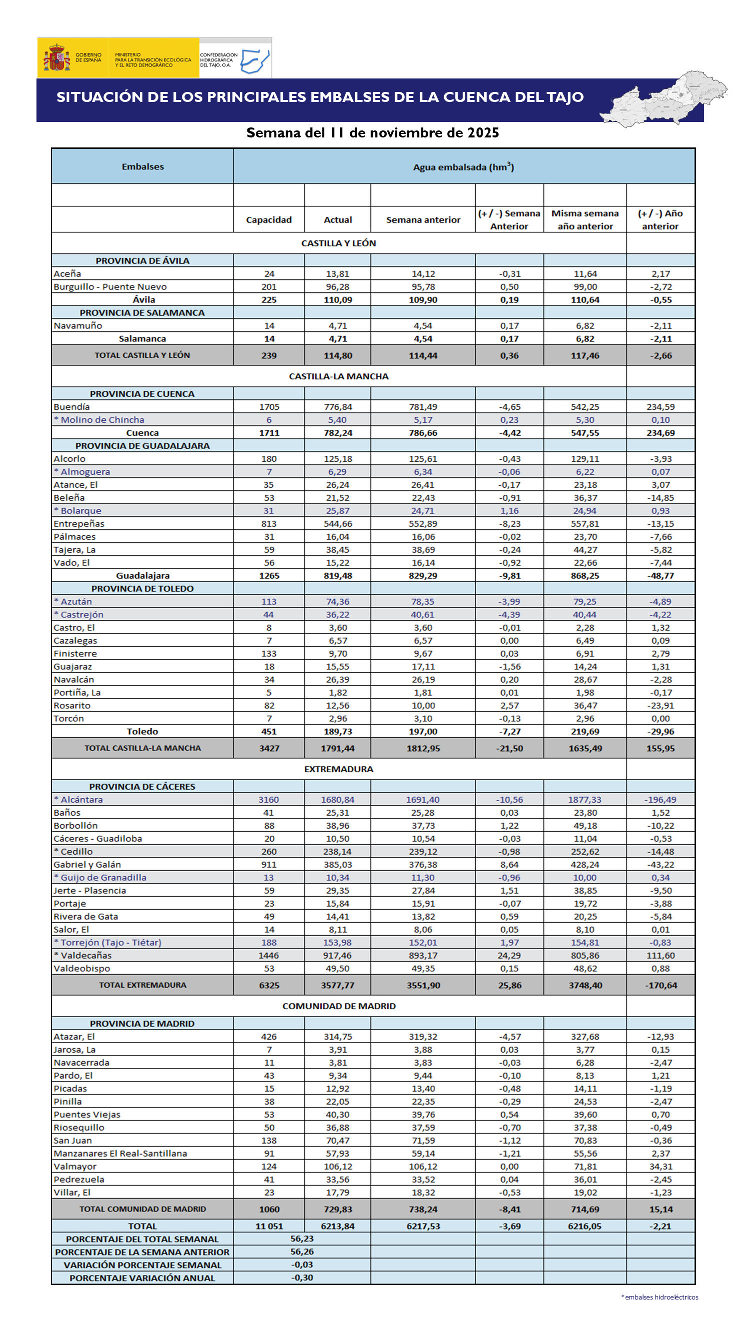 Por comunidades autónomas y por provincias, la reserva hídrica de la cuenca del Tajo presenta el siguiente volumen de agua: