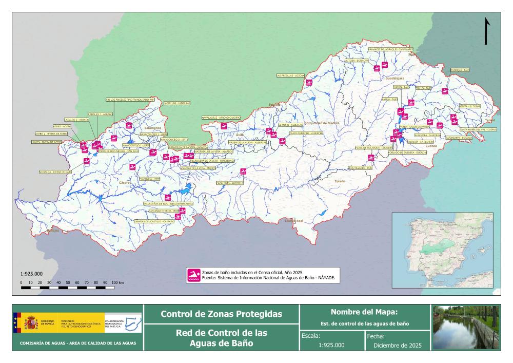 En la parte española de la Demarcación Hidrográfica del Tajo la distribución geográfica de las estaciones de control de aguas de baño se puede consultar en el siguiente mapa: